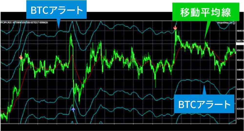 ウェルシェアのシステムは価格の平均値を表す「移動平均線」に対して、上下に独自のエリア「BTCアラート」という基準を設けました。